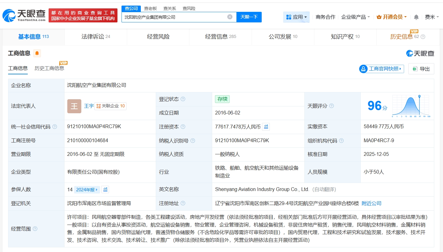 近日,沈阳航空产业集团有限公司发生工商变更,新增辽宁能源投资(集团)有限责任公司、沈阳盛京天使投资基金合伙企业(有限合伙)为股东,注册资本由约5.84亿增至约7.76亿,增幅约33%,同时,多位高管发生变更。