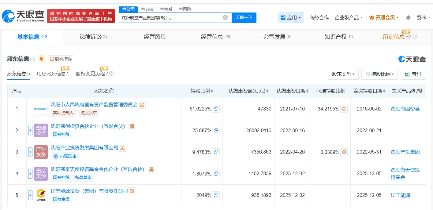 该公司成立于2016年6月,法定代表人为王宇,经营范围包括民用航空器零部件制造、以自有资金从事投资活动、航空运输设备销售、物业管理等,现由沈阳市人民政府国有资产监督管理委员会、沈阳盛创投资合伙企业(有限合伙)、沈阳产业投资发展集团有限公司及上述新增股东共同持股。