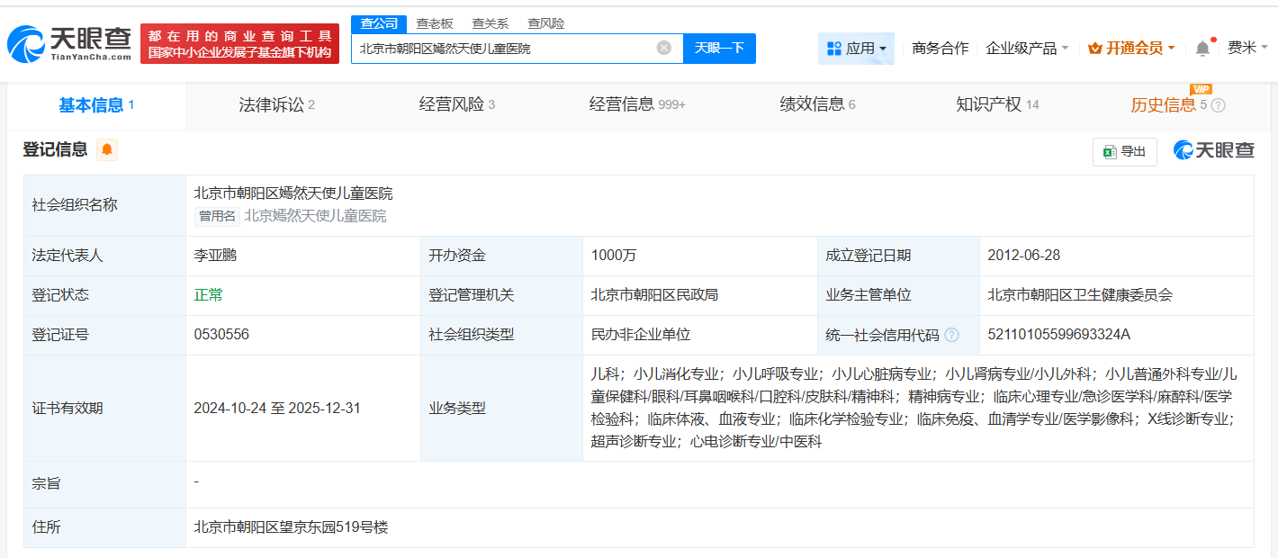 北京市朝阳区嫣然天使儿童医院成立于2012年6月,法定代表人为李亚鹏,开办资金1000万人民币,业务类型包括儿科、小儿消化专业、小儿呼吸专业等。官网显示,该医院由李亚鹏、王菲等八位创始人共同倡导发起成立。