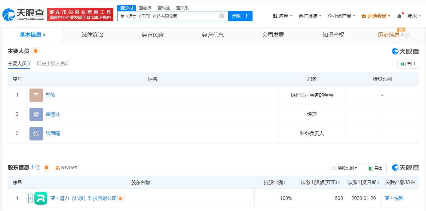 天眼查App显示,近日,萝卜运力(江门)科技有限公司成立,法定代表人为毕然,注册资本500万人民币,经营范围含人工智能基础软件开发、人工智能应用软件开发、计算机系统服务、互联网数据服务、云计算设备制造、网络预约出租汽车经营服务等,由萝卜快跑关联公司萝卜运力(北京)科技有限公司全资持股。