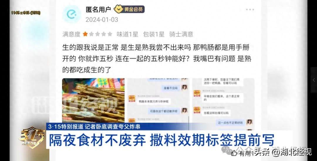 3月14日晚,湖北经视《经视直播》3·15特别报道曝光了夸父炸串武汉白沙天街商铺店员使用隔夜食材,不按照规定废弃,食品撒料的有效期标签提前写。而且在食品加工区域垃圾盖成了沥水架等问题。随后记者联系了夸父炸串总部,工作人员表示已经关注到报道,第一时间安排夸父炸串湖北省分公司负责人赶到涉事门店处理相关问题,涉事门店已经开始闭店整改,所有外卖平台上涉事门店的商品已经全部下架。武汉所有的门店已经连夜开始自查,总部也举一反三的进行了全国门店的自查。