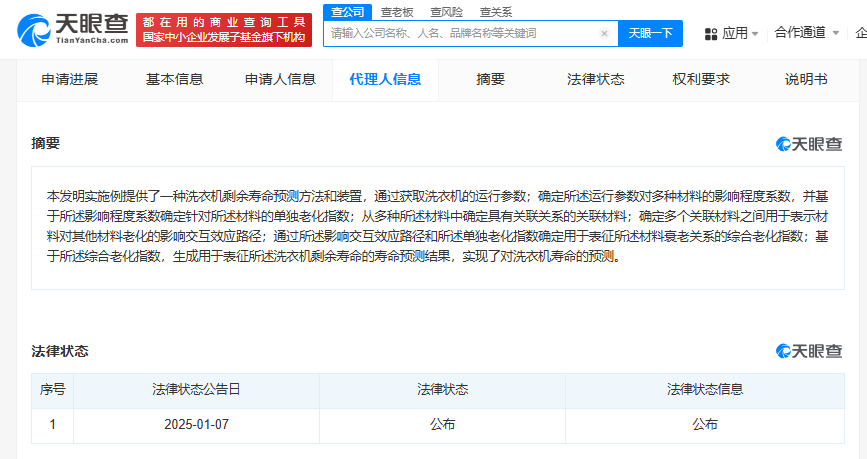 天眼查知识产权信息显示,近日,珠海格力电器股份有限公司申请的“一种洗衣机剩余寿命预测方法和装置”专利公布。