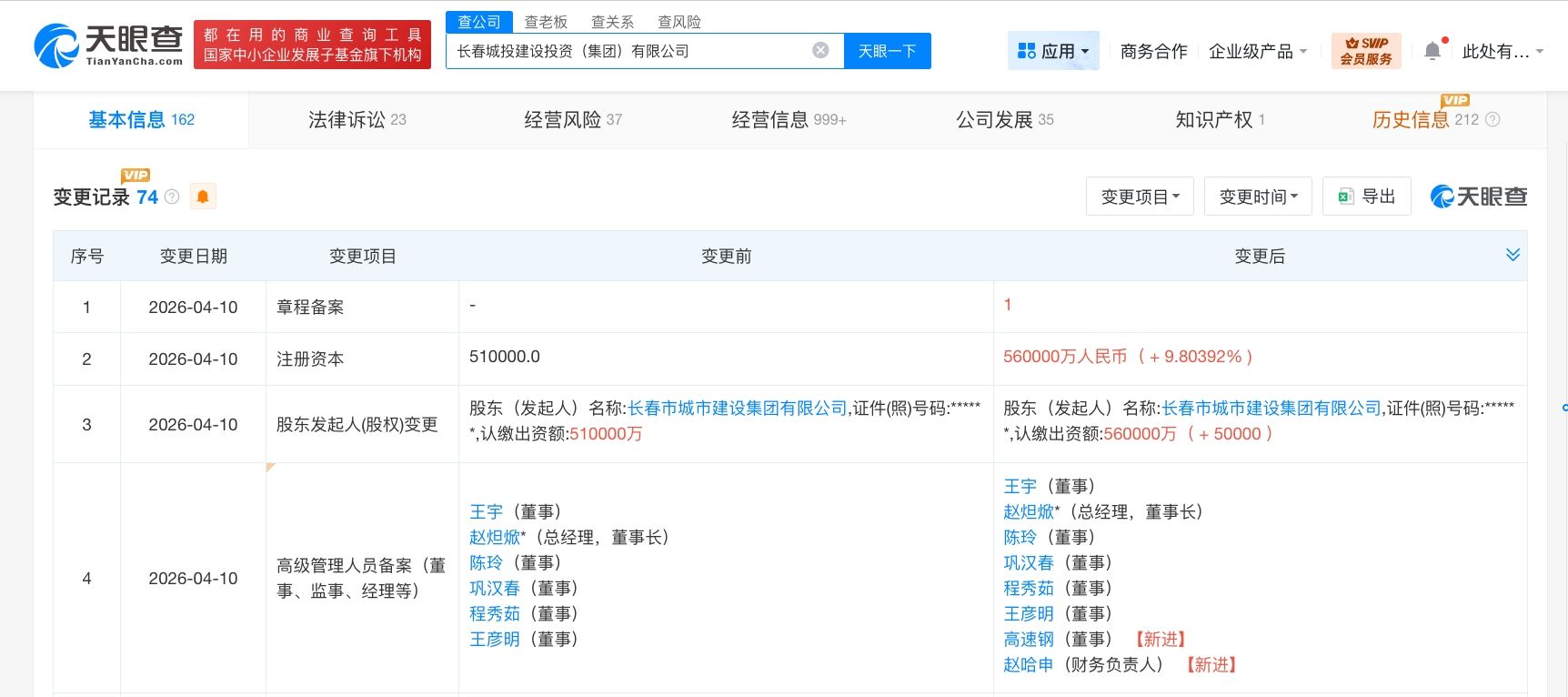 天眼查工商信息显示,近日,长春城投建设投资(集团)有限公司发生工商变更,注册资本由51亿人民币增至56亿人民币,增幅约10%,同时,部分高管发生变更。