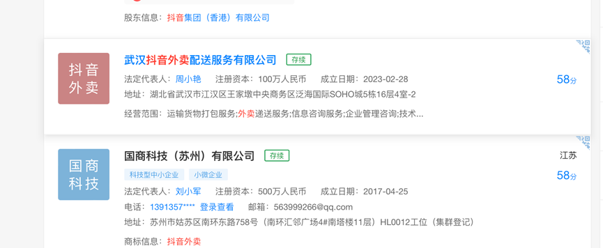 抖音进军本地生活,外卖是始终绕不开的业务。而在配送业务,美团的优势还是很明显的,事实上,做本地生活商业,美团最大的底牌是大规模即时配送能力。天眼查APP显示,今年2月份,有疑似抖音外卖配送服务的公司成立。