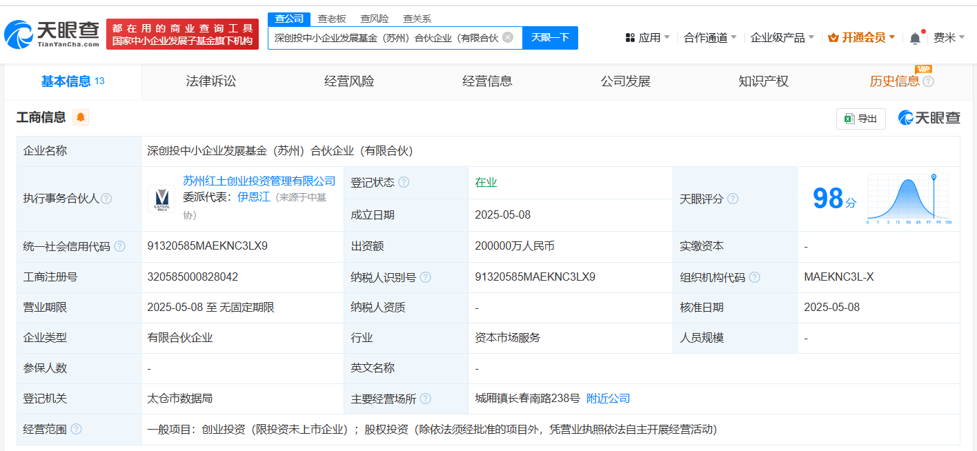 天眼查App显示,近日,深创投中小企业发展基金(苏州)合伙企业(有限合伙)成立,执行事务合伙人为苏州红土创业投资管理有限公司,出资额20亿人民币,经营范围为创业投资、股权投资,由国家中小企业发展基金有限公司、苏州国发创业投资控股有限公司、太仓高新创业投资有限公司等共同出资。