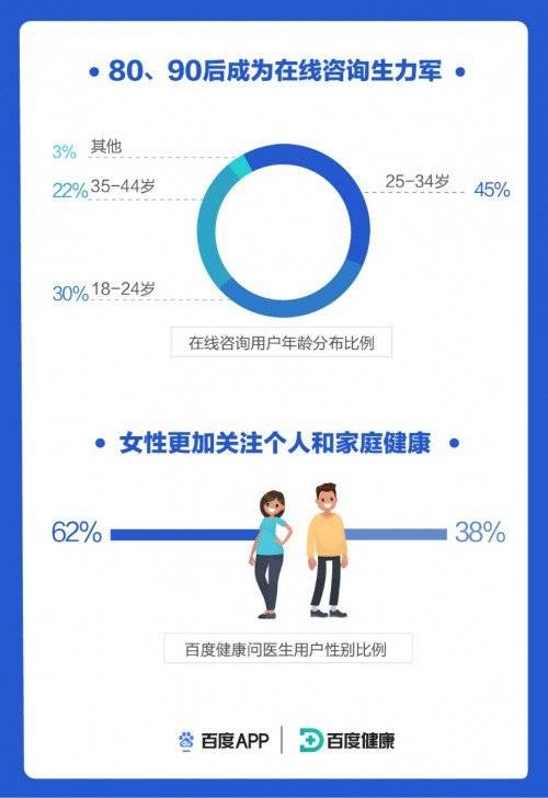 今年3月发布的百度健康在线咨询大数据报告显示,疫情期间咨询量大幅增长,单天提供服务超过85万次,而在线用户中女性占比高达62%。在线咨询用户中25-44岁年龄段占比达到了67%,而这个年龄段的女性多数已婚或当上了妈妈。