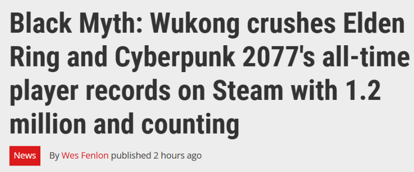 它的成绩不负众望,简单来讲就是:纪录破了、热搜爆了、热度炸了。《黑神话:悟空》为中国游戏行业创造了新的历史。