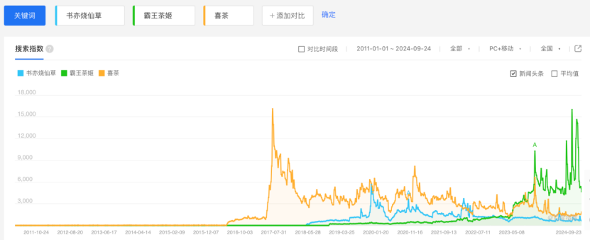 从书亦烧仙草、霸王茶姬、喜茶近10年的百度指数可以看到,2019年到2022年,书亦烧仙草在业内仍有着较为响亮的品牌名气,但之后在行业中的存在感逐渐降低,直至被明显掩盖。