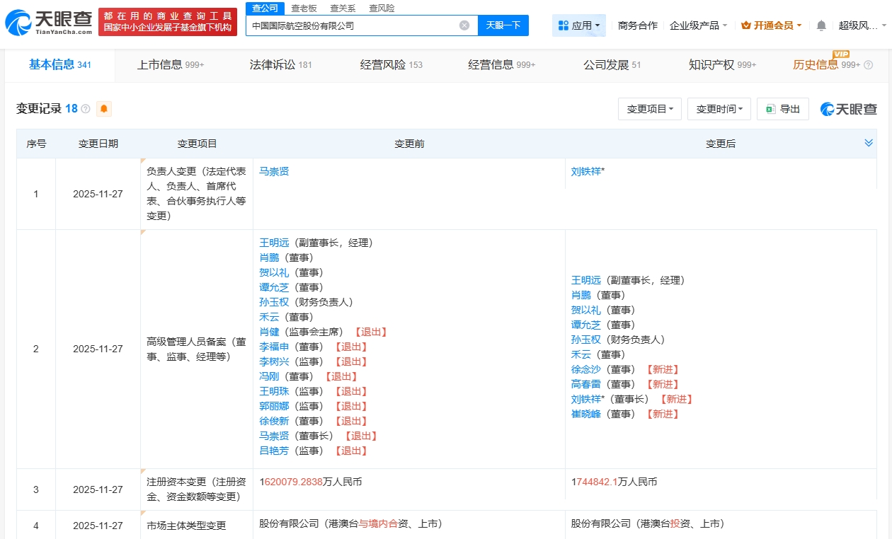 天眼查App显示,近日,中国国航(601111)发生工商变更,马崇贤卸任法定代表人、董事长,由刘铁祥接任,注册资本由约162亿人民币增至约174.48亿人民币,同时多位主要人员发生变更。