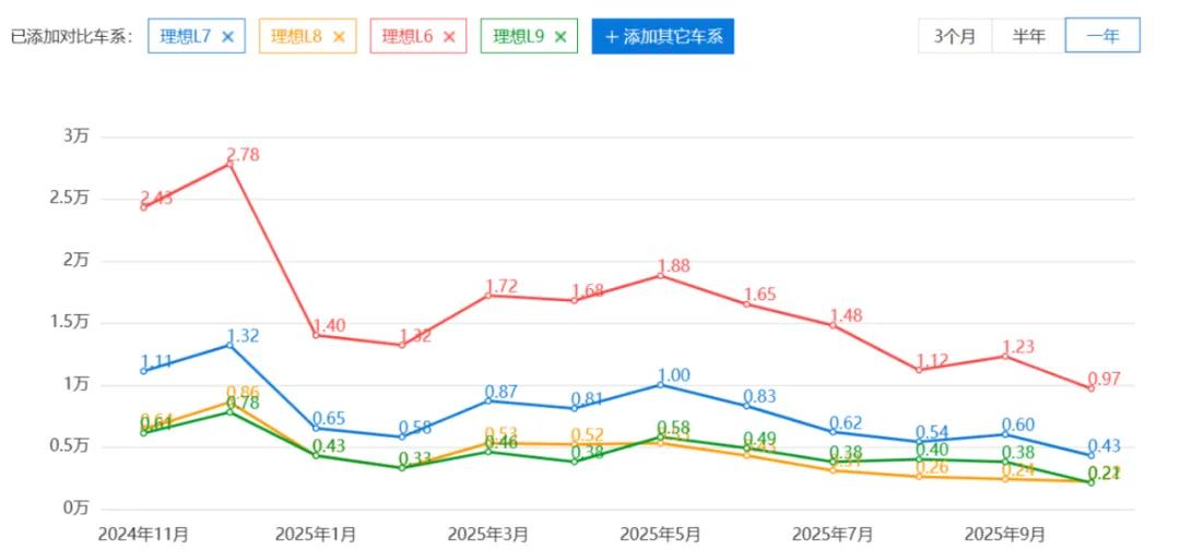 但赚钱的前提是车要卖得出去。今年以来,理想L系列的销量持续走低,来到10月,销量主力理想L6的交付已不到1万,较高峰期近乎腰斩。