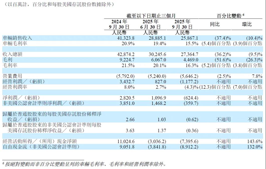 但是,出牌更快的理想,依然没能挽回业绩,甚至交出一份令人始料未及的三季报:营收273.65亿元,同比暴跌36.2%;经调整净亏损为3.60亿元,去年同期净利润为38.51亿元。
