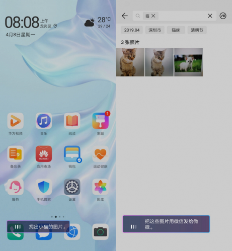 当朋友在微信上找你,想看看你家猫咪小时候的萌照时,难道还得回相册里大海捞针?不用这么麻烦,交给小艺只需两句话就能搞定。说出口令“找出小猫的图片”,小艺将会筛出所有猫咪照片。选定你想发送的照片后,再说一句“把这些照片用微信发给xxx”,xxx就能开始云吸猫了。没错,小艺就是这么聪明和强大,既能听懂你的自然语言,又能快速准确地执行。除此之外,日常的交流小艺都能快速的理解和回应。“屏幕碎了怎么办”、“找一下身份证照片”、“拍夜景”,放心,这些它全部能听懂。听懂后能给你带来什么惊喜,还是交给你来亲自探索!