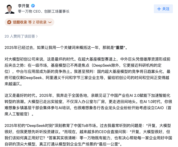 【TechWeb】1月7日消息,零一万物 CEO、创新工场董事长李开复在知乎发文总结2025、展望2026。