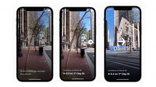 周一发布的iPhone软件iOS 15,包括一个AR地图模式。在这个模式中,苹果地图可以直接指示现实世界中的行走方向——通过在iPhone屏幕上的大箭头告诉用户怎么走——这可能是AR头戴设备的主要功能之一的预览。