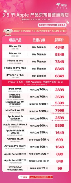 即日起至3月3日,iPhone 15到手价4849元起,指定型号可享限时6期免息,更又一年期 AppleCare+ 额外至高优惠 150 元、iPad低至1999元、M2版本MacBook至高优惠1000元还可额外享6期免息、Apple Watch领券立减400元、第二代AirPods限时低至699元等。