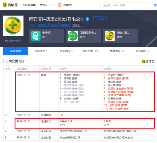 企业名称则由北京奇安信科技有限公司变更为奇安信科技集团股份有限公司,北京奇安信科技有限公司5月15日新增对外投资,奇安信科技集团股份有限公司的注册资本增长了近4亿。