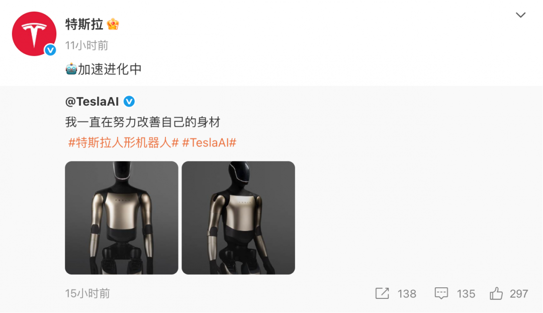 特斯拉开通TeslaAI官方微博 首条博文展示人形机器人快讯