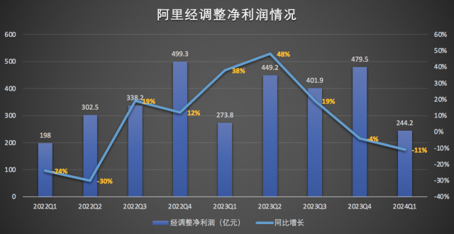 据财报,若不考虑股权激励费用、投资的收益(损失)、无形资产减值以及其他若干项目,截至2024年3月31日止季度,阿里非公认会计准则净利润为244.18亿元,同比下降11%。