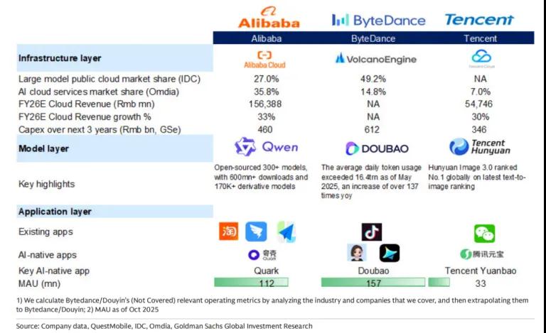 根据高盛最新的中国互联网分析报告,阿里在企业端外部AI云的收入规模上领先,市占率达到35.8%,字节跳动为14.8%,腾讯为7%。
