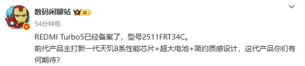 全新的REDMI Turbo 5有望在今年年内问世,REDMI Turbo系列的下一款产品——REDMI Turbo 5已经备案,相比前作REDMI Turbo 4首发搭载的天玑8400系列芯片。