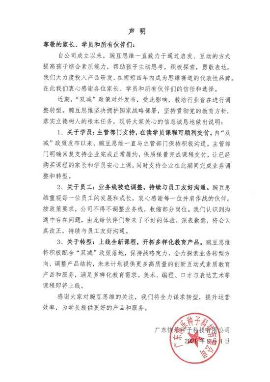 声明指出,关于豌豆思维的后续转型,将上线全新课程,开拓多样化教育产品。全力探索业务转型方向、调整产品结构,未来计划提供更多高质量的创新互动式素质教育产品和服务,满足多样化教育需求。美术、编程、口才与表达艺术等课程即将上线。