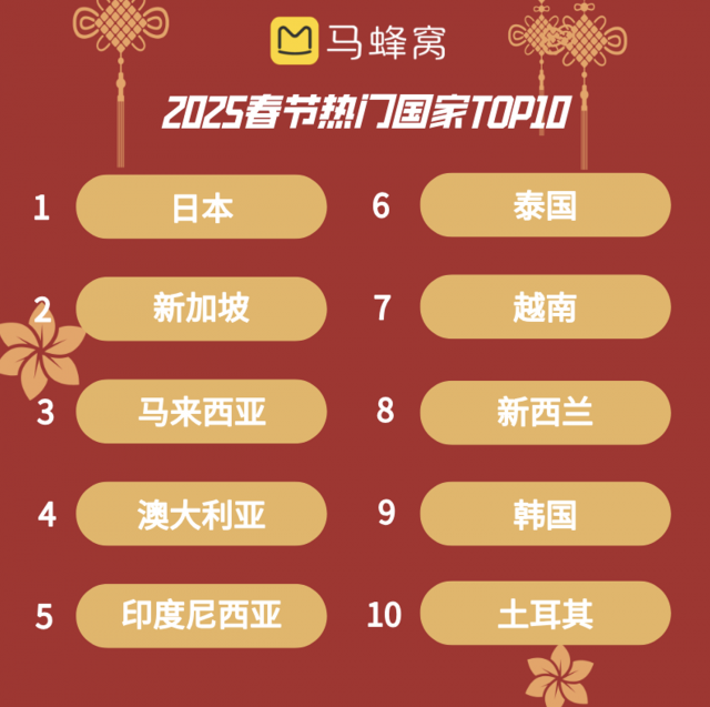 国内市场“热情洋溢”,海外市场同样迎来客流高峰,日本依旧稳坐出境游热门目的地榜首,新加坡、马来西亚、澳大利亚、印度尼西亚、泰国、越南、新西兰、韩国、土耳其进入前十。景色宜人且玩法体验丰富的滨海地区以及热带海岛是全家出国度假首选,春节热门国外目的地榜单中的“含海量”居高不下。