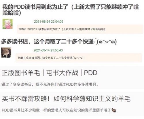 过去一个月,如果在微博、豆瓣或小红书搜索“多多读书月”,类似场景会频繁出现:有网友一口气用完了活动的10本限购名额,热情晒书之时添上一句“战果分享”、“花最少的钱,买最多的书”;又或者,网友前一日刚发帖说“我的PDD读书月到此为止了”,几天以后,帖子主题又加上了一行字(上新太香了只能继续冲了哈哈)。更有读者写就“多多读书月”屯书心得,高呼“YYDS”。