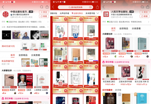 此前,国内众多权威出版社,比如人民文学出版社、中信出版社、人民邮电出版社、知识出版社、浙江文艺出版社等,已在2019年前后入驻拼多多平台,开设官方旗舰店。这些出版社官旗店的图书拼单量早就实现了10万+件,各店也已经积累了数十万读者粉丝的关注,很多店铺月销过百万码洋。