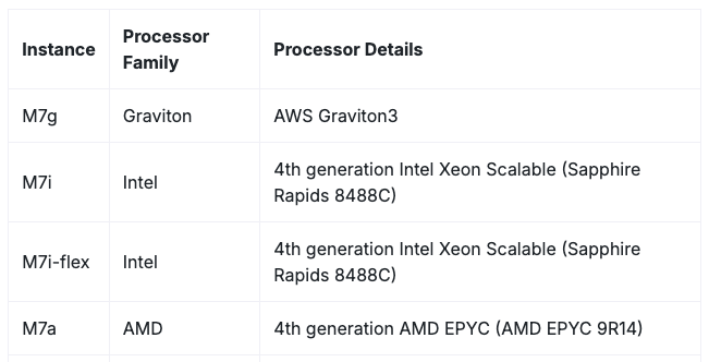 这里面,采用Amazon Graviton的M7g系列、采用英特尔的M7i系列、采用AMD的M7a系列都是亚马逊云科技提供给客户的实例,客户可以根据自身IT架构、业务需求、成本需要等多方面因素综合考虑选择适合自己的最优实例方案。