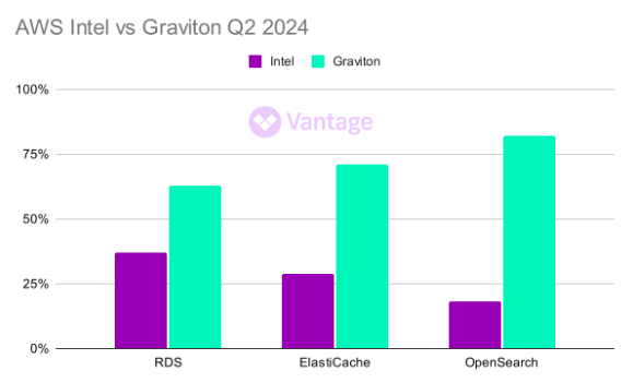 Vantage数据显示,2024年第二季度,在Amazon RDS、Amazon ElastiCache和Amazon OpenSearch托管服务中,客户选择使用基于Graviton已超越了英特尔,越来越多客户选择基于Graviton的托管服务。