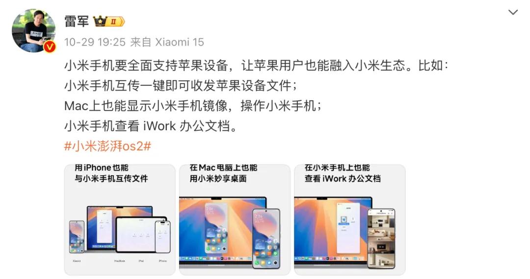 小米手机全面支持苹果设备 图源:雷军微博