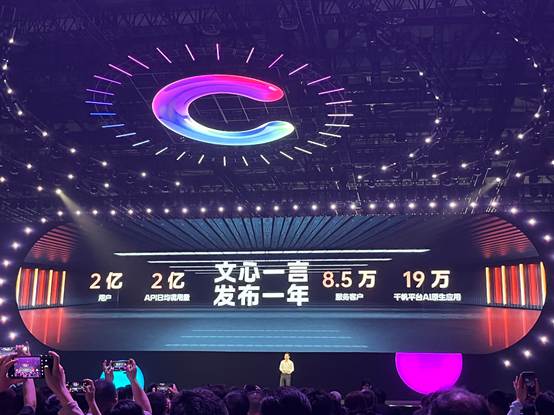 李彦宏在会上透露:“文心一言从去年3月16日首发,到今天是一年零一个月的时间。我们的用户数突破了2亿,每天API的调用量也突破了2亿,服务客户数或者说企业达到了8.5万,利用千帆平台开发的AI原生应用数超过了19万。”