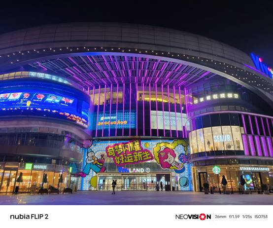 在夜景拍摄方面,努比亚Flip 2同样表现出色。主摄通过优化算法和OIS光学防抖技术,能够在低光环境下拍摄出清晰明亮的照片。虽然与一些高端旗舰手机相比还有一定差距,但在同价位折叠屏手机中已经处于领先地位。同时手机的夜景模式也非常强大能够通过长时间曝光和算法优化拍摄出更加纯净且富有细节的夜景照片。