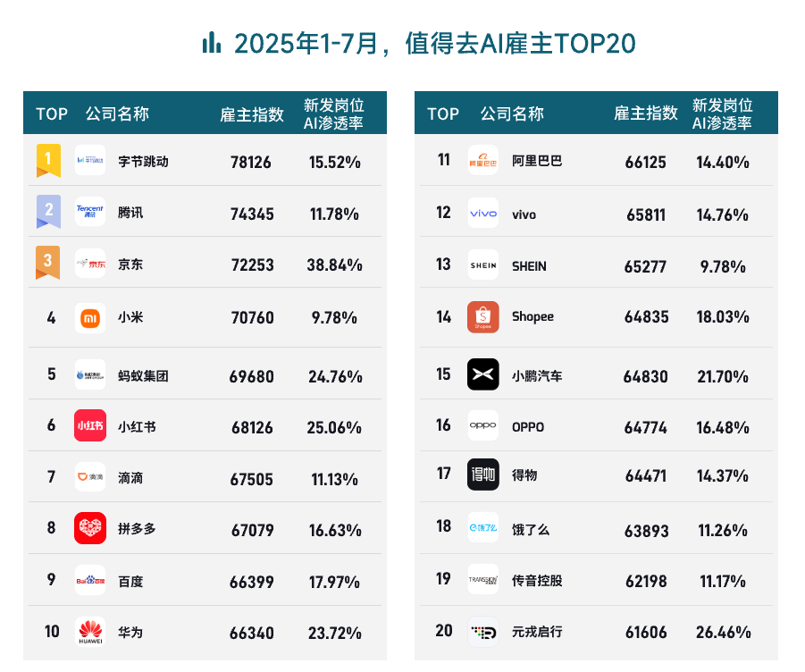 字节跳动、腾讯、京东位列“值得去AI雇主”TOP3,小米、华为、小鹏汽车、元戎启行等新能源汽车、自动驾驶等企业也进入值得去AI雇主TOP20。此排名根据脉脉雇主指数9月1日数据得出。脉脉雇主指数是企业近⼀年口碑的量化呈现,涵盖⼯作强度、团队氛围、薪酬福利、⾯试/离职体验等多维⼝碑数据。