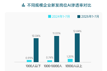 不同规模企业的AI化进程显著加速,新发岗位AI渗透率明显提升。2025年1-7月,新经济行业新发岗位AI渗透率超过10%,较去年同期提升10倍以上,且随企业规模扩大而提升。《报告》显示,“新发岗位AI渗透率”为新发AI相关岗位量在所有新发岗位中的占比,是衡量企业对AI投入的重要指标。