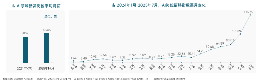 2025年7月,AI相关新发岗位数量同比增长超过10倍,简历投递量同比增长11倍。薪酬也水涨船高,2025年1-7月,AI新发岗位平均月薪达到61,475元,较2024年同期的58,921元上涨4.33%。