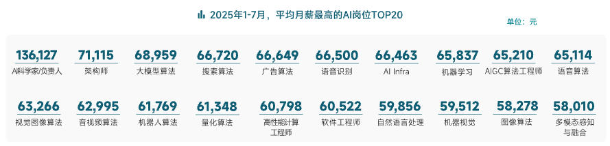 AI领域高薪争夺年轻人的趋势也愈加明显。2025年1-7月,平均月薪在5万元-8万元的新发应届生岗位占比高达42.66%,8万元以上的超高薪岗位也达到了14.68%,相当于每7个AI应届生岗,就有1个年薪百万。
