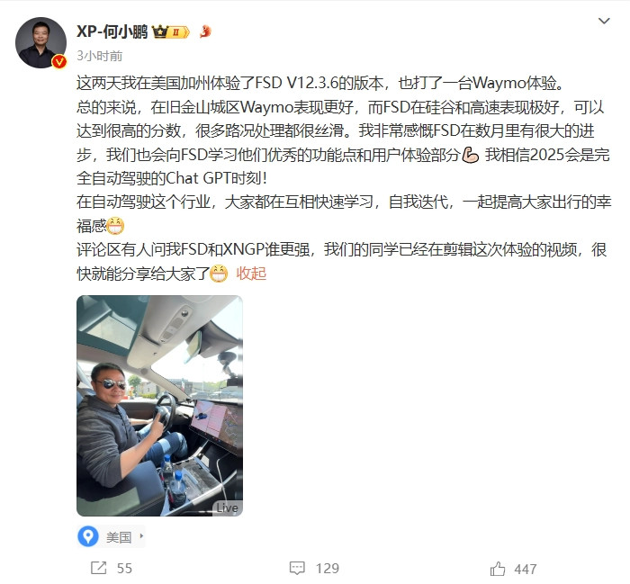 6 月 25 日消息,今日,小鹏汽车董事长何小鹏在微博分享了其在美国加州针对特斯拉 FSD V12.3.6 的版本和 Waymo 的自动驾驶体验。