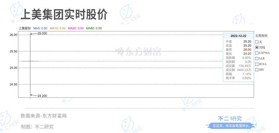 上美集团此次IPO募资净额约为8.35亿港元,开盘价为25.20港元/股,与发行价持平;盘中一度破发,最低触及24.2港元/股。截至12月22日收盘,上美集团平收25.20港元/股,对应市值100亿港元(折合人民币约为89.56亿元)。
