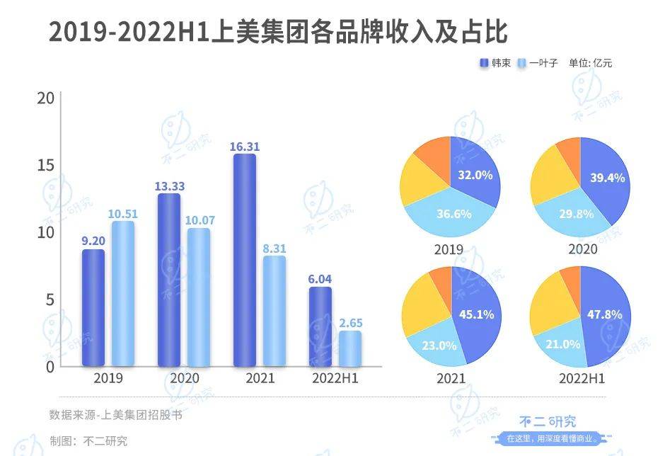 多品牌策略走到今天,上美最出名的还是韩束和一叶子。