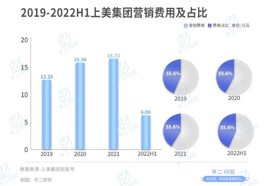 招股书显示,2019-2022上半年,上美的营销费用分别为13.25亿、15.36亿、15.72亿及6.08亿,占营收的比例分别为46.1%、45.4%、43.4%及48.2%。珀莱雅、丸美及上海家化2022上半年的营销费用同样都在40%以上;以营销闻名的逸仙电商则有超过60%的营收用于推广。