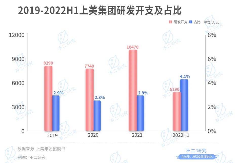 2019-2022上半年,上美研发开支分别为8290万、7740万、10470万及5190万,营收占比为2.9%、2.3%、2.9%及4.1%,其中2019~2020年有所回落。