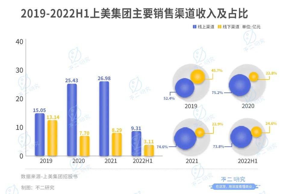 根据招股书,上美的线上渠道贡献了超七成营收,2019-2022上半年分别为15.05亿、25.43亿、26.98亿及9.31亿,占比分别为52.4%、75.2%、74.6%及73.8%;线下营收分别为13.14亿、7.70亿、8.29亿及3.11亿,占比从45.7%锐减到24.6%。