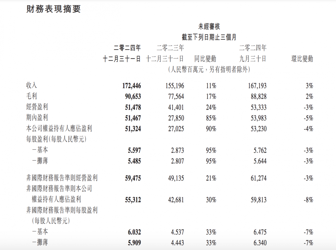 2024年全年,腾讯总收入6602.57亿元,同比增长8%;本公司权益持有人应占盈利1940.73亿元,同比增长68%;非国际财务报告准则本公司权益持有人应占盈利2227.03亿元,同比增长41%。
