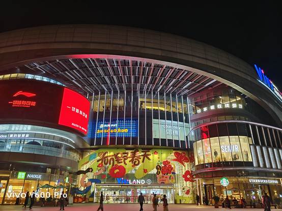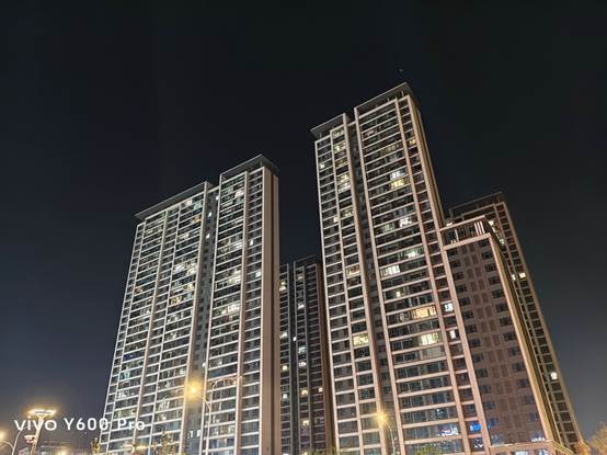 夜景是检验手机影像能力的「试金石」,凭借大底传感器和vivo的算法,该机夜景高光压制得当,暗部细节也有一定保留。在开启「夜景」模式后,通过多帧合成与AI降噪,画质显著提升,暗部纯净度提高,建筑轮廓更清晰,天空噪点几乎不可见。而面对极暗场景(如仅有月光的小区),Y600 Pro会触发「极夜模式」,画面亮度大幅提升,但细节损失较多,色彩偏灰。这是硬件规格的客观限制,在同价位中仍属正常表现。