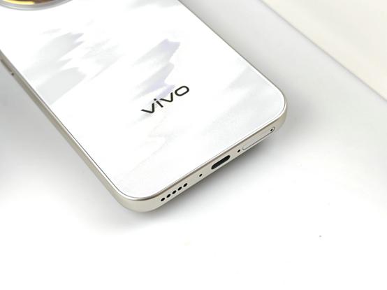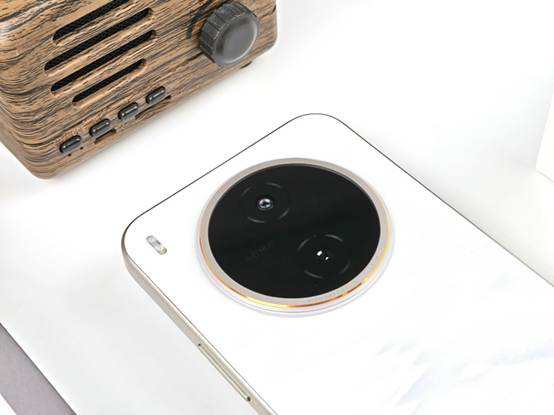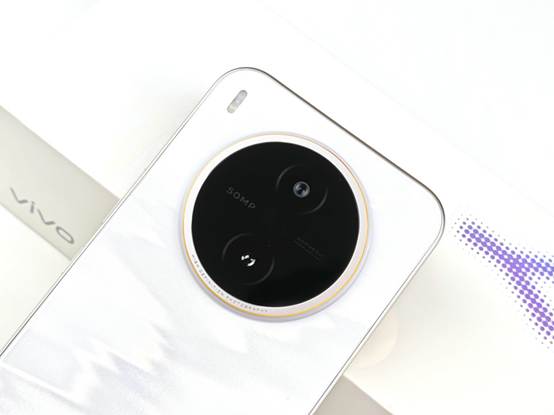 背部的视觉焦点,无疑是那个硕大的圆形相机模组。vivo为其命名为「浮光跃金镜环」——环绕镜头模组的金属外圈采用航空铝精密雕琢,底座环圈以高级制表工艺镌刻齿轮纹理,棱角分明,坚固耐用。并可以为镜头玻璃提供物理保护,降低平放桌面时的磨损风险。