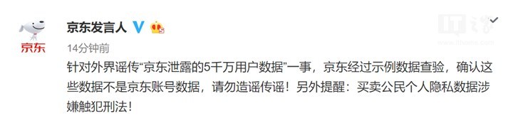 微博原文:针对外界谣传“京东泄露的5千万用户数据”一事,京东经过示例数据查验,确认这些数据不是京东账号数据,请勿造谣传谣!另外提醒:买卖公民个人隐私数据涉嫌触犯刑法!