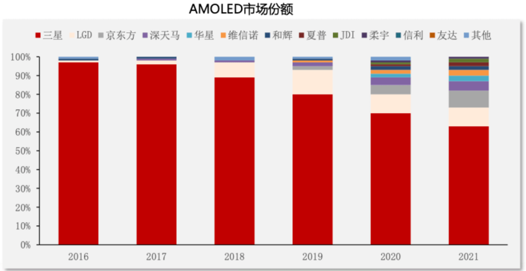 在中小尺寸面板领域,2015年左右,退出LCD业务的三星转而全力投入OLED相关的研发,并取得了明显的技术优势。在三星的引领下,中高端手机现在基本都采用了OLED屏幕或者从属于OLED技术的柔性AMOLED屏幕。