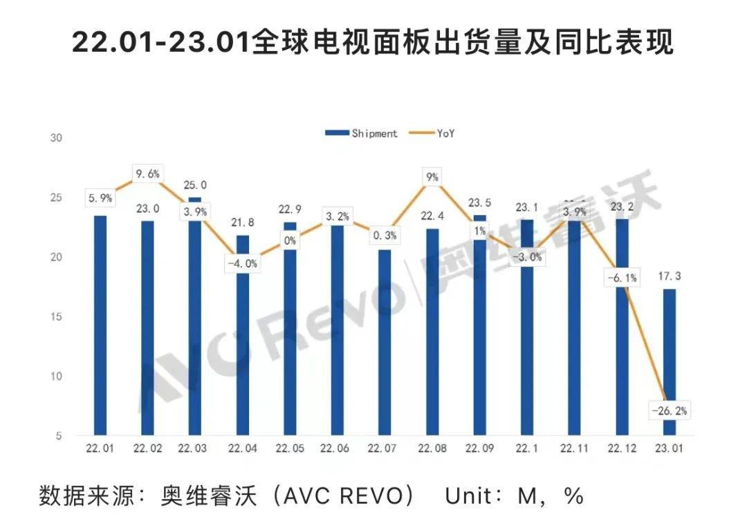 数据显示,经历了去年Q4的上扬后,今年1月TV面板出货量再度大降。根据奥维云网最新数据,1月全球LCD+OLED电视面板出货1730百万片,出货量同比下降26.2%,环比下降25.3%。