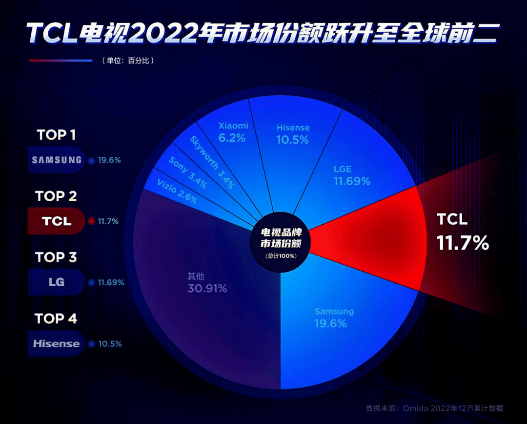 不仅如此,TCL还在Miniled面板上不断创新,引领全球电视面板产业的格局。据统计,2023年Mini LED背光电视的出货量将从2022年的320万台增加到2023年的380万台,渗透率从1.5%提高到1.7%。
